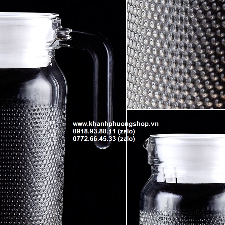 Bình nước 1.2L có thiết kế độc đáo tạo sự tinh tế nhờ vào độ sáng bóng và trong suốt của thủy tinh cao cấp. Bình nước dung tích 1.8 lít, thiết kế dạng bầu cùng tay cầm lửng độc đáo, mang lại cảm giác chắc chắn, không trơn trượt khi sử dụng.