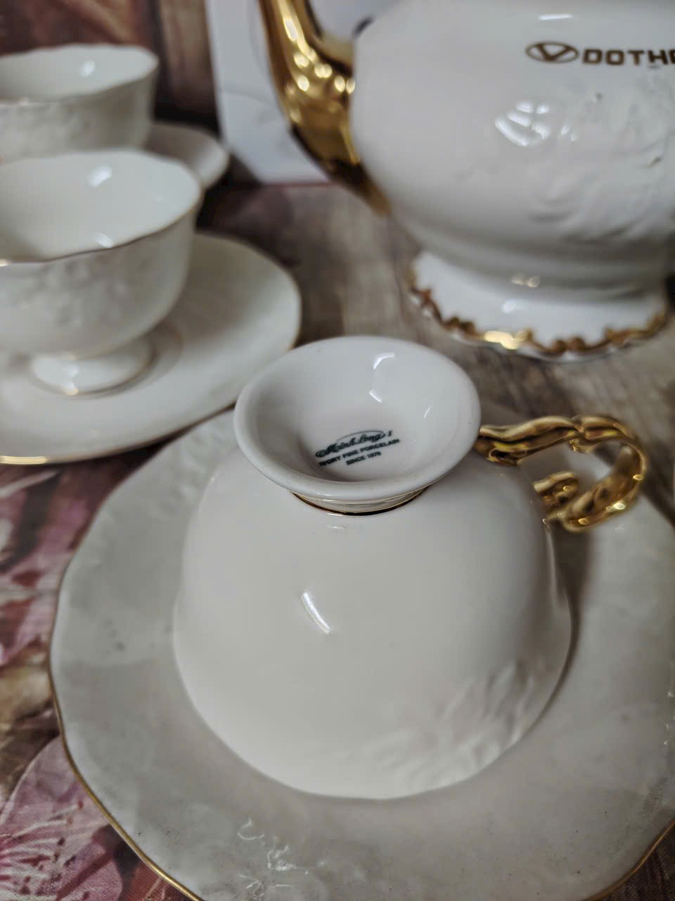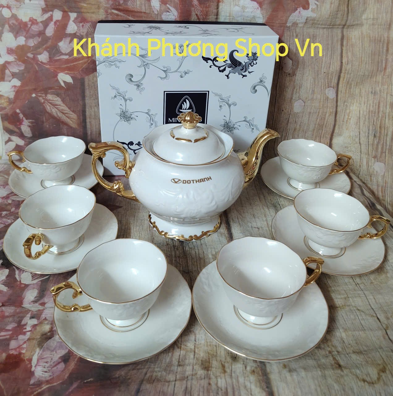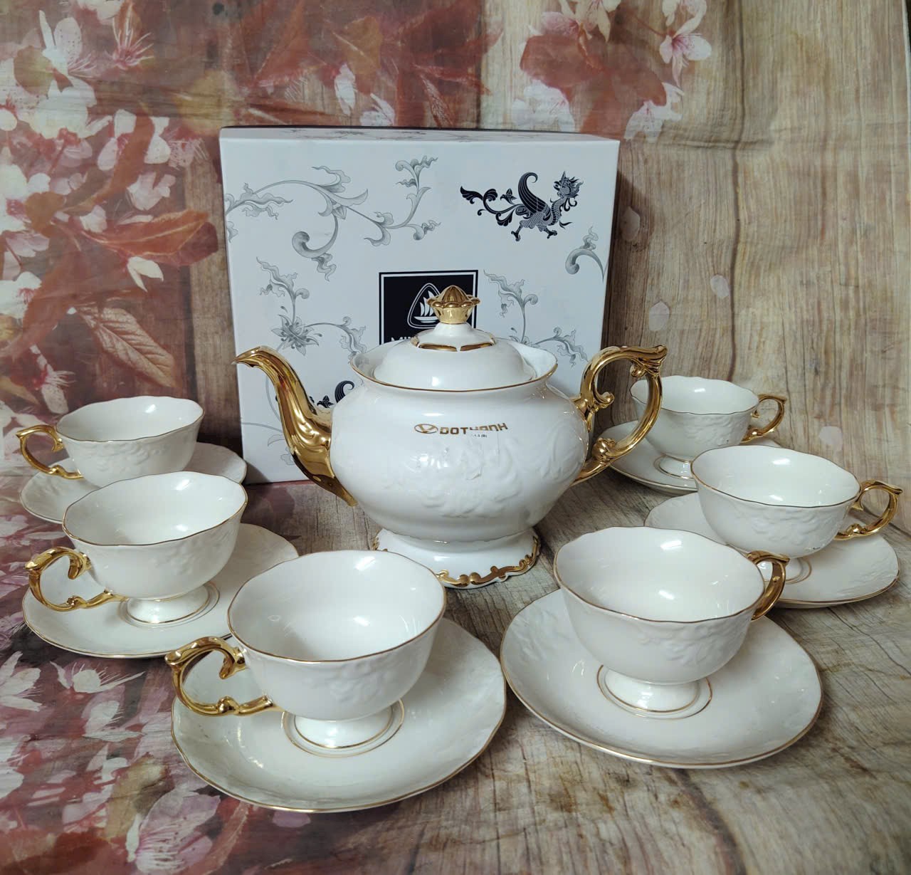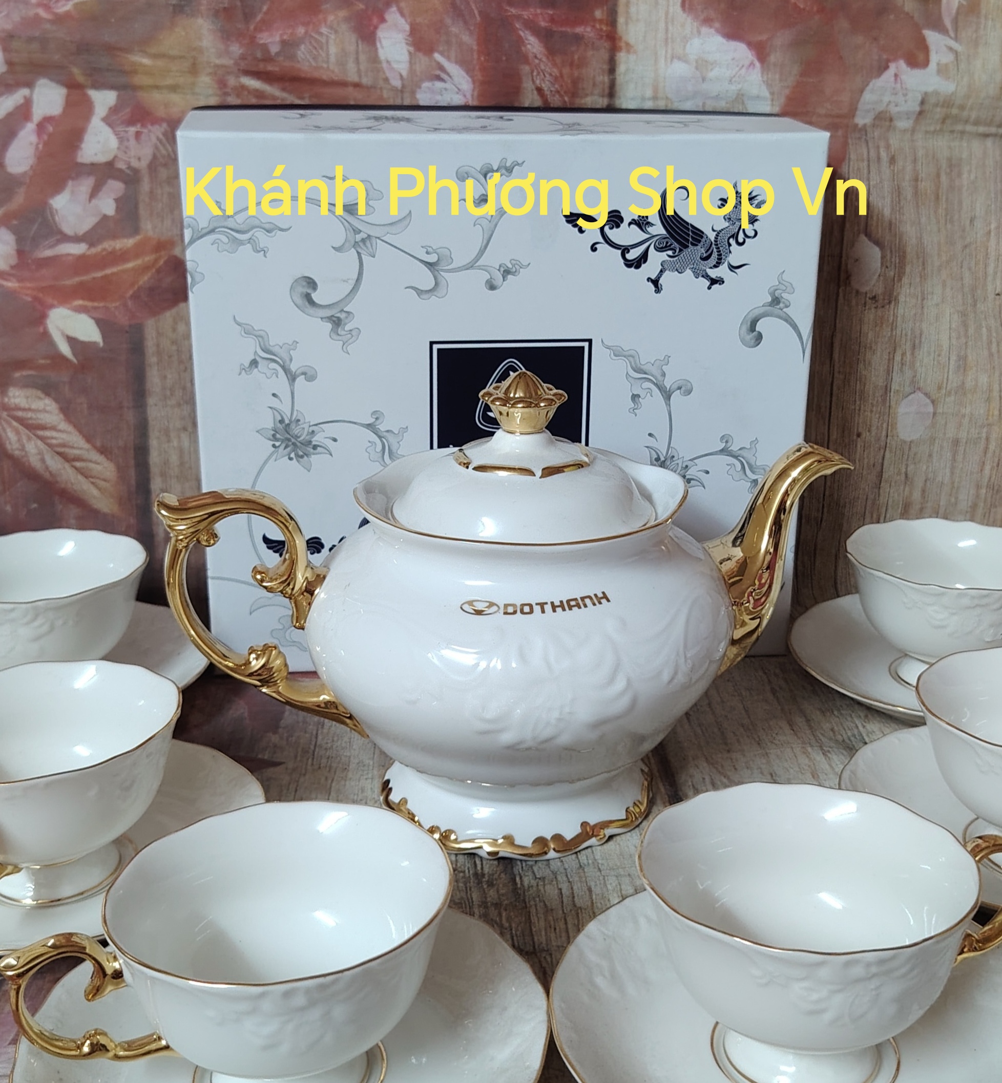 Bộ sản phẩm Đài các toát lên vẻ đẹp kiêu sa, lộng lẫy theo phong cách quyền quý hoàng gia. Bộ sản phẩm có kiểu dáng sang trọng, nhiều đường nét được cách điệu, uốn lượn với dáng điệu mềm mại, mảnh mai. Cái tài của các nghệ nhân là đã khéo léo viền chỉ vàng ở những điểm nổi bật như vành chén, vành đĩa, tay cầm và nắp bình trà, trong đó nổi bật là núm sen vàng sang trọng. Hoa văn được nhấn nhá bằng những đường viền óng ánh vô cùng đẹp mắt, , càng tôn lên vẻ đẹp đẳng cấp của không gian ẩm thực cũng như phong cách thẩm mỹ của chủ sở hữu.